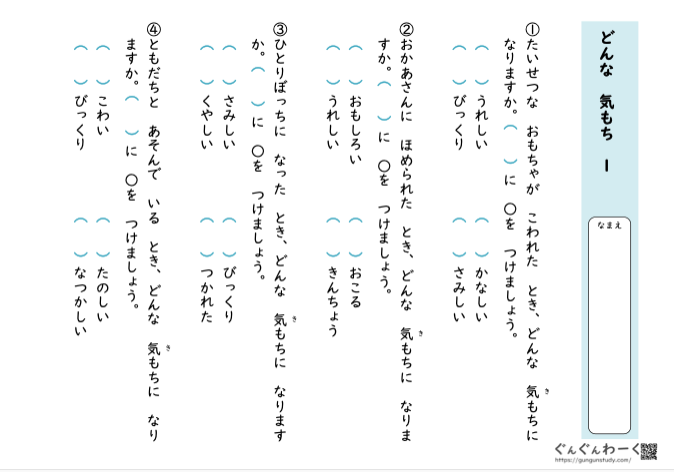 ③どんな気持ちプリント(授業で配りましたが今日のFBの内容からもプリントできます)