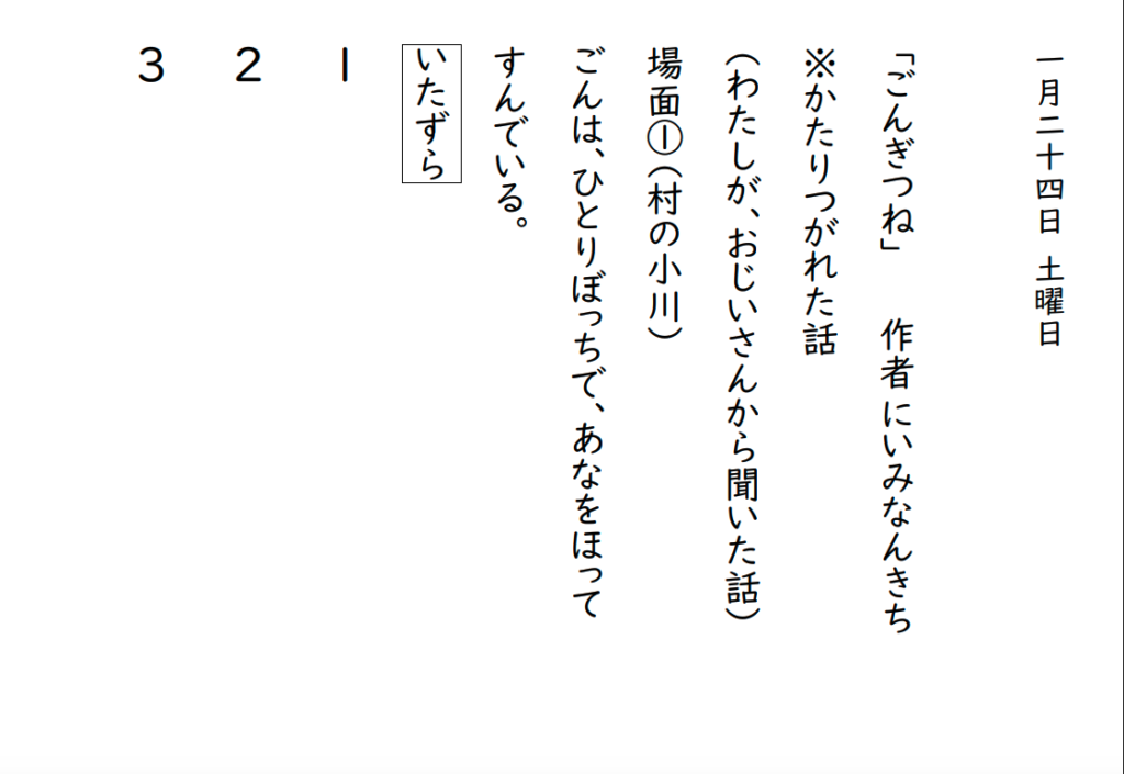 宿題は、ごんがした3つのいたずらをノートに記入するよう伝えました。