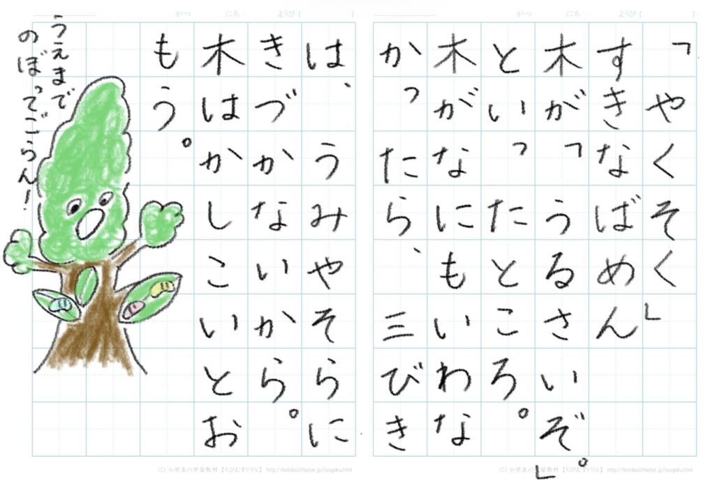 今日は、物語の残りの場面、ケンカをしていた三匹に木が声をかけるところから、最後まで読みました。